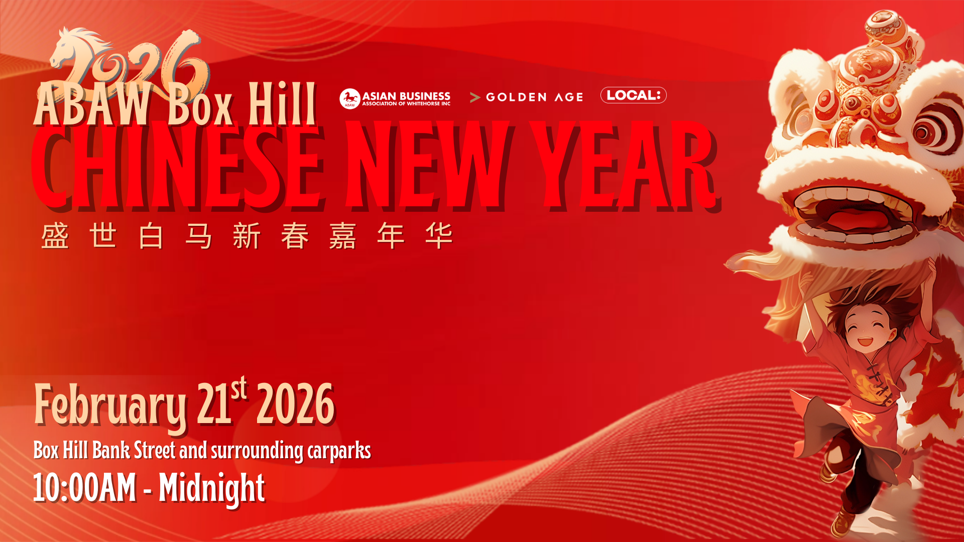 Get ready for the biggest event on the Box Hill calendar! The Asian Business Association of Whitehorse Inc. (ABAW) invites you to immerse yourself in the sights, sounds, and flavors of the 2026 Box Hill Chinese New Year Festival on Saturday, 21 February 2026.